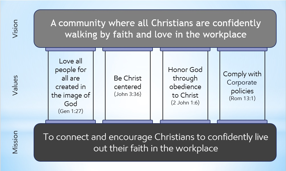 Faith and work don’t have to be separate. We see opportunity here to help Christians bring their full selves to work, to connect with other Christians and deepen their faith, and to come together and demonstrate Christ’s love. We operate as a registered 501(c)(3) non-profit and exist to fulfill this mission.